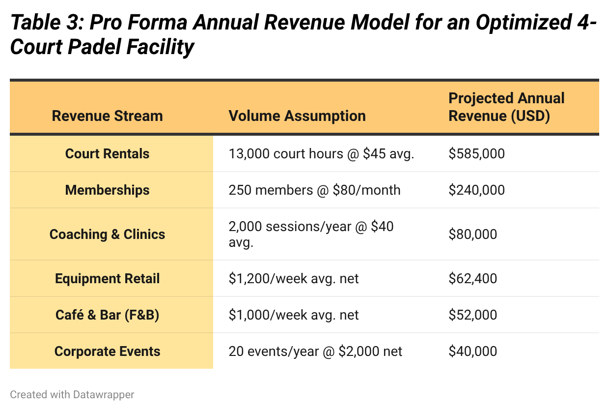 Note: Based on local reports shared on TikTok, building a padel court in Argentina ranges from $25,000 to $50,000 USD—significantly less than the other regions in this table. However, local revenue is correspondingly lower due to the currency exchange rate.