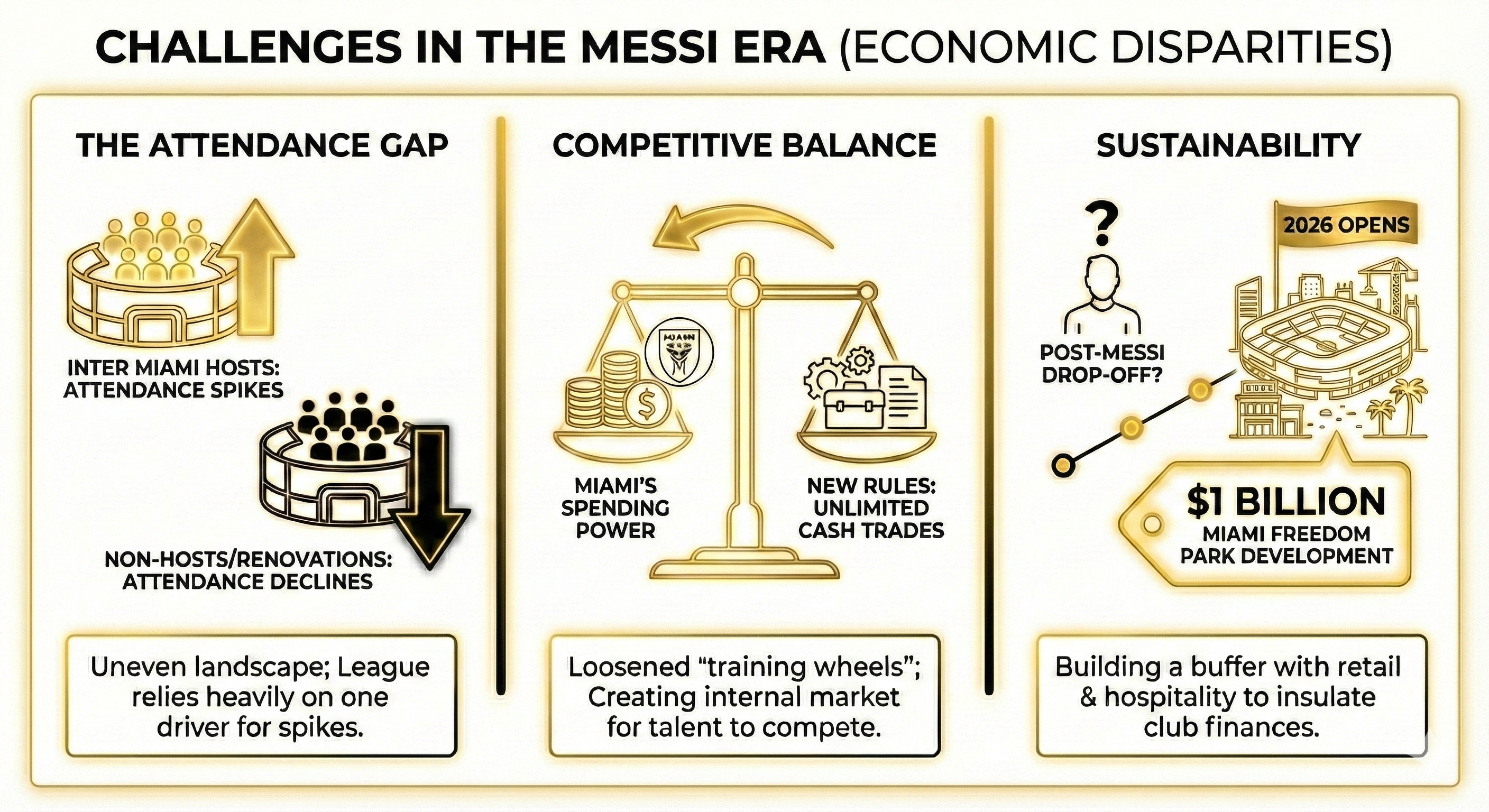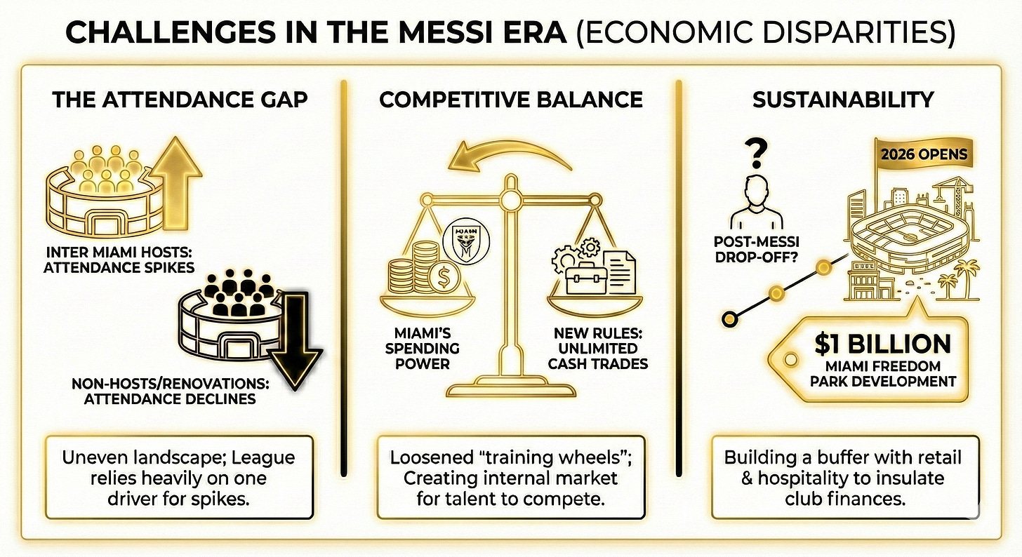The Attendance Gap: While Inter Miami drives spikes for hosts, teams that did not host Miami or were undergoing renovations saw attendance declines, highlighting an uneven landscape where the league relies heavily on one driver14.