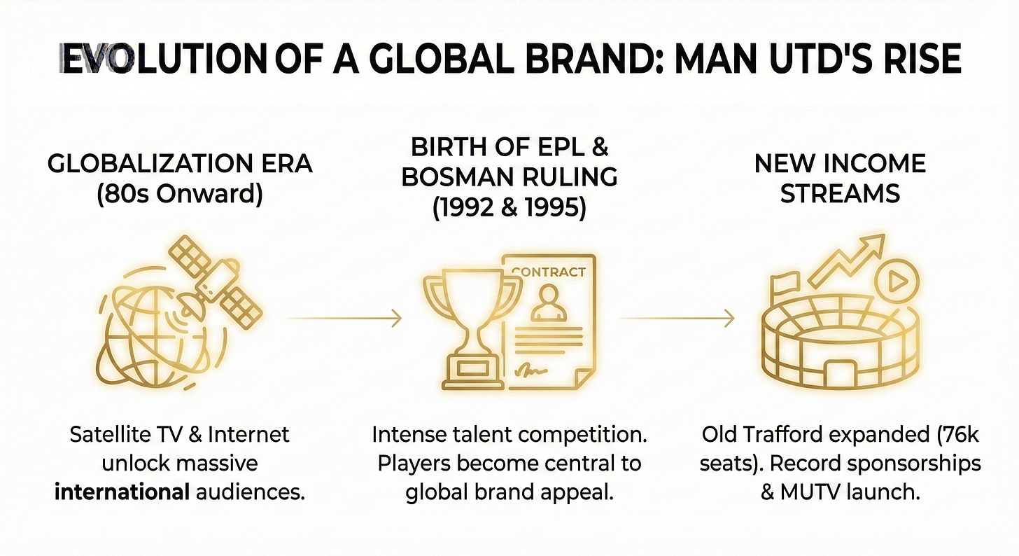 To tell this story, I want to split it into two parts. First, we’ll look at how Manchester United evolved from a regional team into a leading global brand—a journey that peaked with Malcolm Glazer’s 2005 takeover. We will cover the second part (the post-Glazer era) afterward.