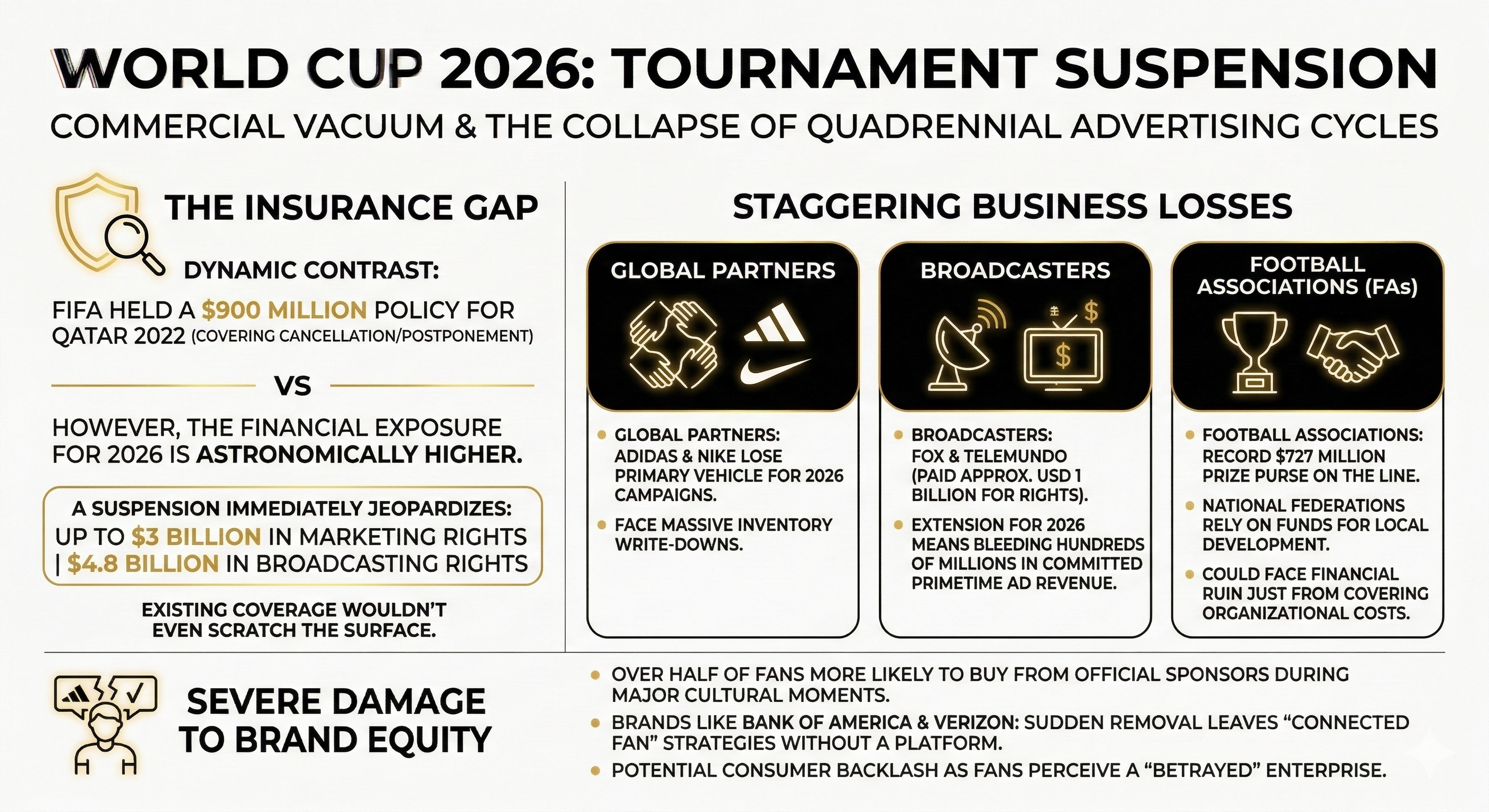 Consider the insurance gap: FIFA held a $900 million policy for Qatar 2022 covering cancellation and postponement12. However, the financial exposure for 2026 is astronomically higher. A suspension would immediately jeopardize up to $3 billion in marketing rights and $4.8 billion in broadcasting rights —meaning any existing coverage wouldn’t even scratch the surface.