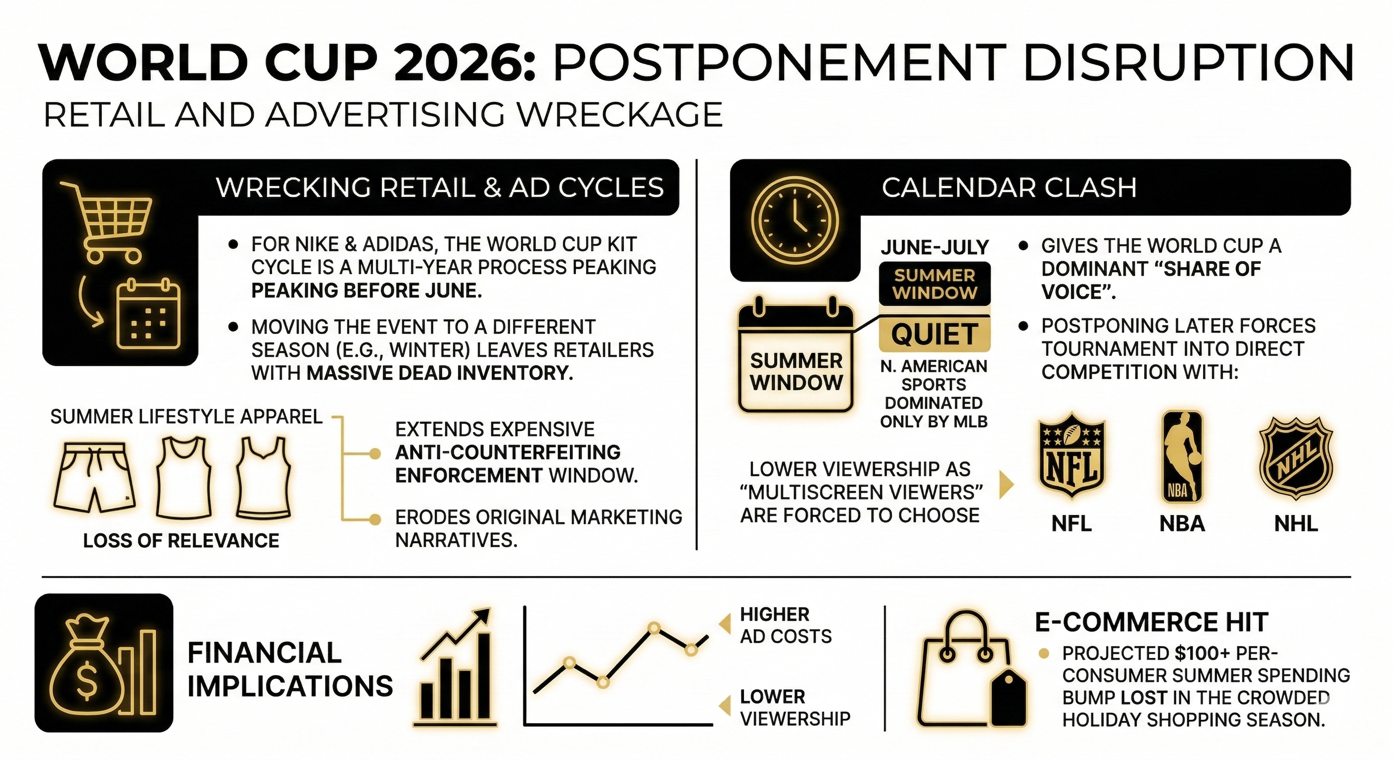 Then there is the calendar clash. The June-July summer window is a traditionally “quiet” period in North American sports, dominated only by MLB. This gives the World Cup a dominant “share of voice.” Postponing to later in the year forces the tournament into direct competition with the NFL, NBA, and NHL. This means higher ad costs and lower viewership as the “multiscreen viewer” is forced to choose between the World Cup and massive domestic leagues. E-commerce would also take a hit, as the projected $100+ per-consumer summer spending bump would get lost in the crowded holiday shopping season25.