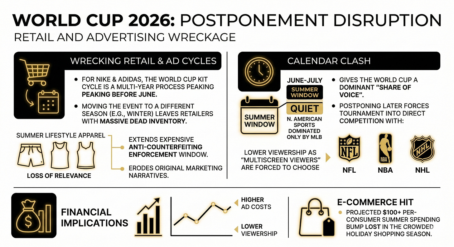 A postponement of the 2026 World Cup would wreck the meticulously planned retail and advertising cycles of global brands. For the sportswear giants, the World Cup kit cycle is a multi-year process peaking right before June.