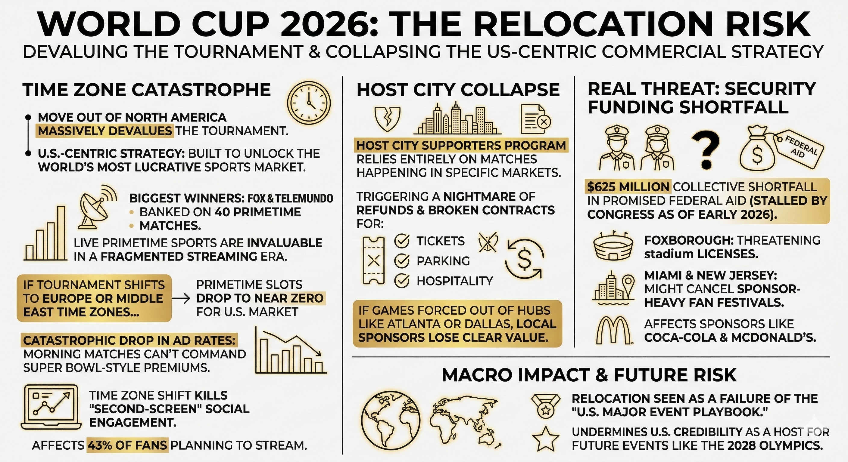 This threat is very real. As of early 2026, U.S. host cities are facing a collective shortfall of up to $625 million in promised federal security aid, stalled by Congressional disputes. Cities like Foxborough are threatening to withhold stadium licenses without this funding22, while Miami and New Jersey might cancel sponsor-heavy fan festivals —a key activation point for sponsors like Coca-Cola and McDonald’s— altogether23.