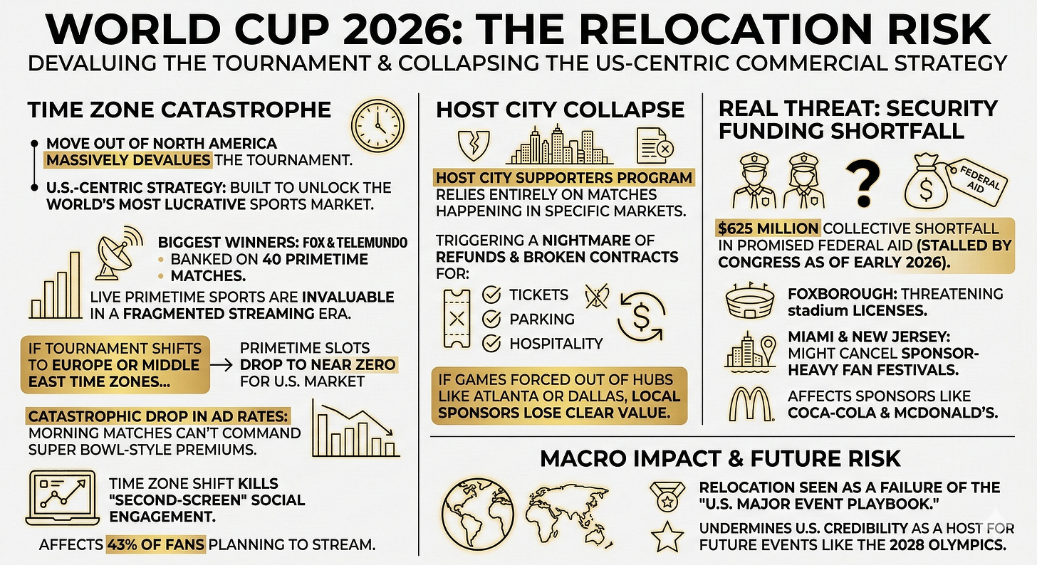 Primetime U.S. broadcasts, hospitality pricing and sponsor activations all hinge on that assumption. Once the commercial model is built so tightly around a single market and calendar slot, it leaves no space for flexibility.